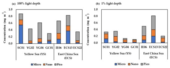 Seawater samples of size-fractionated chlorophyll-a were collected at the two light depths (100% and 1% PAR penetration) at all the stations (total number of samples: 14). Each water sample (0.5 L) was passed sequentially through 20, 2, and then 0.7 µm filters to separate out micro- (>20 µm), nano- (2–20 µm), and pico-size (0.7–2 µm) phytoplankton, respectively [23,24]. The filters were wrapped in aluminum foil to prevent photolysis and stored in a freezer (−20 °C) in the laboratory for further analysis. The concentrations of the size-fractionated chlorophyll-a were analyzed using a precalibrated fluorometer (Turner Designs model 10-AU) based on the procedure of [25].