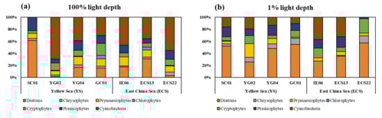 The apparent spatial distribution pattern in phytoplankton community composition according to the study regions (i.e., YS and ECS) was not observed during the late summer of 2020 (Figure 4). The major phytoplankton groups were diatoms and cyanobacteria, whereas dinoflagellates were not found in this study (Figure 4). Cyanobacteria made the greatest contribution to the total phytoplankton community at a 100% light depth (range = 30.5–69.5%; mean ± S.D. = 46.1 ± 14.4%) for all the stations except SC01, where diatoms (61.3%) were found to be the dominant class and cyanobacteria were absent (Figure 4a). Diatoms (range = 1.5–31.1%; mean ± S.D. = 14.8 ± 10.8%; except SC01), prymnesiophytes (range = 6.7–14.9%; mean ± S.D. = 11.2 ± 2.9%), cryptophytes (range = 4.3–20.1%; mean ± S.D. = 10.0 ± 5.2%), and prasinophytes (range = 6.4–22.4%; mean ± S.D. = 13.1 ± 5.4%) made medium-level contributions to the total phytoplankton community at a 100% euphotic depth for all the YS and the ECS stations, whereas chrysophytes (range = 2.0–5.7%; mean ± S.D. = 3.4 ± 1.2%) and chlorophytes (range = 0.0–5.6%; mean ± S.D. = 1.9 ± 2.4%) presented low-level contributions (Figure 4a). At a 1% light depth in the study area, the main species that made up the entire phytoplankton community were diatoms (range = 27.2–57.2%; mean ± S.D. = 42.9 ± 13.3%) (Figure 4b). Cyanobacteria (range = 0.0–37.1%; mean ± S.D. = 18.5 ± 12.8%), prasinophytes (range = 2.2–17.4%; mean ± S.D. = 12.7 ± 5.3%), and cryptophytes (range = 5.1–24.1%; mean ± S.D. = 11.9 ± 6.7%) were the ancillary groups in the phytoplankton community composition, whereas the contributions of prymnesiophytes (range = 1.6–22.9%; mean ± S.D. = 7.7 ± 7.0%), chrysophytes (range = 0.0–12.1%; mean ± S.D. = 6.1 ± 4.5%), and chlorophytes (range = 0.0–0.6%; mean ± S.D. = 0.1 ± 0.2%) to the total phytoplankton community were low (Figure 4b).