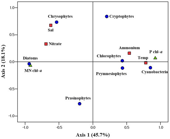 Principle component analysis (PCA) ordination plots of axes 1 and 2 showing the phytoplankton community structure in relation to physical (temperature and salinity), chemical (nitrate and ammonium), and biological (size-fractionated chlorophyll-a) environmental variables in the YS and ECS during late summer of 2020. Temp: water temperature; Sal: salinity; MN chl-a: sum of the ratio of micro- and nano-sized chlorophyll-a concentration to total chlorophyll-a concentration; P chl-a: ratio of pico-sized chlorophyll-a concentration to total chlorophyll-a concentration.
