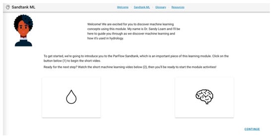 Users can access Sandtank-ML via: https://sandtank-ml.hydroframe.org (accessed on 25 October 2021). This URL directs users to the welcome page (Figure 1), where you are introduced to Dr. Sandy Loam, who will guide users through the application and provide additional information as needed. Because we are interested in using this application to both promote understanding and adoption of ML and broaden understanding of who engages in computer and geoscience education, we strategically designed the main character of the app to be a woman of color. Existing data indicate that only approximately 15% of individuals in the computer science workforce are people of color [13] and research has repeatedly indicated that the representations of scientists and engineers are key to shaping differential rates of entry and retention in STEM fields and careers [14,15,16]. Similarly, Geoscience fields continue to collectively be the least diverse in STEM [17]. Dr. Loam works to introduce a non-typical representation of a computer scientist and geoscientist. The welcome page houses two videos (under development): a video that introduces the ParFlow Sandtank, which is a foundational piece of Sandtank-ML; and an introductory machine learning video, that will provide users with the background information and context to successfully use the application (Figure 1).