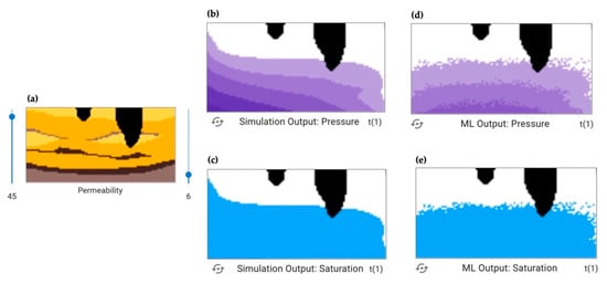 Once users have generated ML outputs, there is an opportunity to compare and analyze outputs from the ML models to the physically based simulation, which is the goal of the ML predictive model. The left column output, “ML output: Pressure/Saturation”, allows users to visually compare the predicted output to the simulation output, where a pixelated or mismatching image represents less agreement between the simulation and the ML. For example, Figure 3 shows (a) the input conditions for the simulation, (b) the “goal” simulation output for pressure, (c) the “goal” simulation output for saturation, (d) the ML pressure output using a dry training set, and (e) the ML saturation output using a dry training set. It is clear that the ML outputs do not accurately represent the simulation results. The image shapes do not align well and there is significant pixelation (panels d, e) which indicates that the ML model would need more training (with potentially more data or more representative data) to achieve better results.