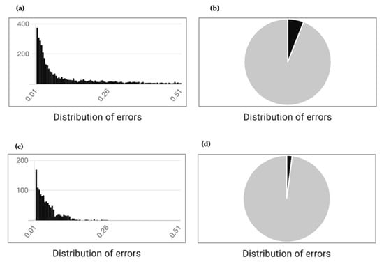 Display of a Sandtank-ML application run, showing the distribution of errors outputs for (a) a dry dataset pressure output, (b) a dry dataset saturation output, (c) an all dataset pressure output, and (d) an all dataset saturation output.