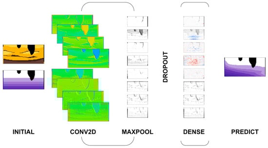 As Figure 9 shows, our network uses a two-dimensional convolutional layer (CONV2D) followed by a pooling layer (MAXPOOL) to downsample the features. MAXPOOL removes the position and orientation bias while reducing the overall size of the final dense layer (DENSE). These two elements are a common pattern for CNN and may be repeated one or more times to detect features at different scales. Next, we introduce a dropout layer (DROPOUT) to prevent our model from overfitting by randomly setting some outgoing edges to 0 at each update of the training phase. The uncertainties of our numerical model are constructed naturally as we move from a physical model to a mathematical model through to a computer model using simplifying assumptions. So, a dropout layer can be used to approximate uncertainties [33] for neural networks (NN). Finally, the dense layer uses L1Loss to drive the training for regression.