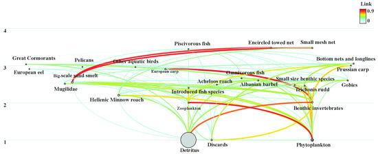 Food-web structure in Lake Trichonis 2019. Circle size proportionally represents the biomass of each functional group and lines indicate the trophic links between functional groups. Color of the lines illustrate the magnitude of the flow rates. Numbers on the left side indicate the trophic food web levels.