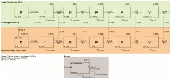 The lake was also characterized by a simple structured food web (TB/TST: 0.009, and SOI: 0.269) as almost all biomass was concentrated in the first two trophic levels (approximately 95%), with low biomass transfer values between the various trophic levels. The reduction in transfer efficiency from the trophic levels TL I and TL II upwards has also been observed in other lake ecosystems [61]. Mass flows in the ecosystem and keystone species analysis also indicated the importance of low-trophic-level groups in relation to the higher-trophic-level ones. Particularly, the fact that phytoplankton and detritus had a positive effect on various functional groups, as depicted by the MTI, highlights the significance of bottom-up processes in the regulation of the food web [61]. This is also confirmed by the high keystoneness of the lower-trophic-level functional groups of the lake (i.e., phytoplankton and zooplankton). The value of the Finn Cycling Index (6.669), which represents the fraction of the total flows that is recycled [39], fell within the limits estimated in other models (Pantanal lakes, Brazil: [62]) and was relatively low, highlighting the low energy recycling flow.