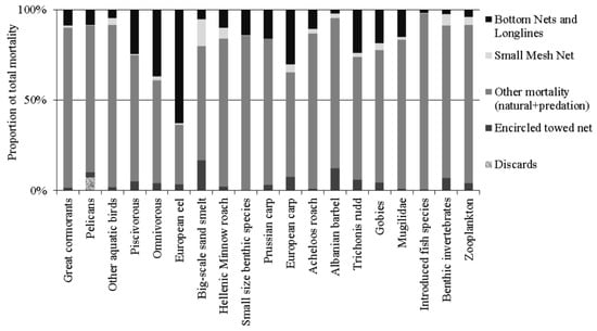 The exploitation rate (fishing mortality/total mortality) imposed by the fisheries was high for A. boyeri, A. anguilla and C. carpio (Figure 3). Predation mortality due to high intraspecific competition was higher than 50% for the low functional groups (zooplankton and benthic invertebrates) and for T. hellenicus, C. gibelio and small benthic fish (Figure 3).