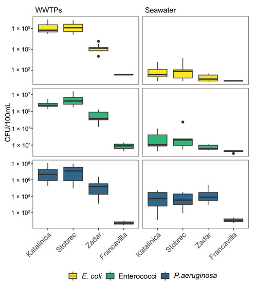 Seawater samples collected in the proximity of the sewage outfall points were characterized by the FIB average contents of FIB: E. coli 2.7 × 102, 8.5 × 102, 9.2 × 100, and 0.5 × 100 CFU/100 mL and enterococci 1.8 × 102, 7.8 × 102, 5.1 × 100, and 1.2 × 102 CFU/100 mL, for Katalinića, Stobreč, Zadar, and Francavilla, respectively. Conversely, P. aeruginosa count in seawater was higher than FIB, with 1.7 × 104, 1.2 × 104, 5.5 × 104, and 5.5 × 100 CFU/100 mL, for Katalinića, Stobreč, Zadar, and Francavilla, respectively.