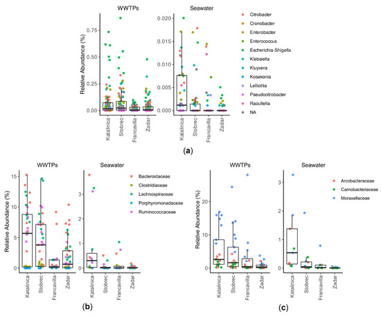 Relative abundances of fecal indicator bacteria in treated sewage (WWTPs) and seawater samples. (a) Traditional fecal indicator bacteria (i.e., families Enterobacteriaceae and Enterococcaceae). (b) Alternative fecal indicator taxa: feces-associated families. (c) Alternative fecal indicator taxa: sewage-associated genera. Data are the average relative abundance of each taxon over time. Boxplots show the variation of the total relative abundances in each category.