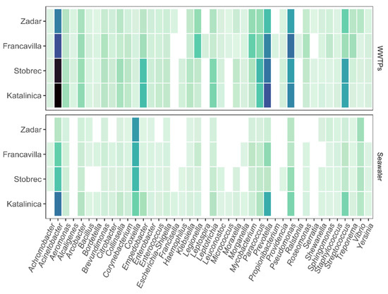 Potentially pathogenic bacteria in treated sewage (WWTPs) and seawater samples. Out of the 60 genera investigated Bacteriodes, Borrelia, Brucella, Burkolderia, Campylobacter, Chlamydia, Enterobacter, Laclercia. Listeria, Orientia, Rosemonas, and Salmonella were not found in the dataset. ASV raw counts are log(1 + x) transformed to improve visualization and comparisons between samples. Tiles represent the average count over time per site. Higher values correspond to darker colors. White tiles indicate 0 reads.