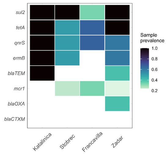 Figure 6 shows ARG presence/absence distribution (% of samples positive for a given gene) in marine sites investigated here due to the low number of observations as quantifiable abundances (i.e., we found several samples to be <LOQ or positive but not quantifiable due to specificity issues, as shown in Figure S4). As observed for WWTP samples, ermB, qnrS, sul2, and tetA were found in higher concentrations and more constantly than the other ARGs. On the contrary, the most abundant gene in marine samples was sul2, with concentrations up to 1.6 × 10−3 copies/16S rDNA copy (Stobreč, February 2020). Interestingly, mcr-1 was rarely found and in concentration usually <LOQ, although few seawater samples collected next to Francavilla and Zadar WWTP discharging points were higher than LOQ, with average values of 1.9 × 10−4 and 1.4 × 10−4 copies/16S rDNA copy, respectively.