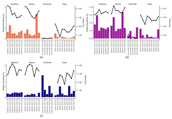 As the microbial signature of fecal pollution, a data subset of fecal indicator taxa was obtained extracting ASVs belonging to the traditional fecal indicator taxa (i.e., the family Enterobacteriaceae, which includes the genus Escherichia, and the family Enterobacteriaceae, that includes the genus Enterococcus), and to alternative fecal indicator taxa, according to the approach proposed by Newton et al. [67]. In particular, five feces-associated bacterial families (i.e., Bacteroidaceae, Porphyromonadaceae, Clostridiaceae, Lachnospiraceae, and Ruminococcaceae) were used as signatures of fecal (both human and non-human) contamination. Three sewer infrastructure-associated bacterial genera (i.e., Acinetobacter, Arcobacter, and Trichococcus) were used as signatures of sewage contamination [31]. The diversity and abundance of potentially pathogenic bacteria were investigated by creating a data subset of 60 genera, as selected from a combination of public databases ([68]; https://www.bode-science-center.com/center/relevant-pathogens-from-a-z.html (accessed on 15 September 2021)). For this study, we included Shewanella, as strains affiliated with this genus are considered emerging marine pathogens [28,69].