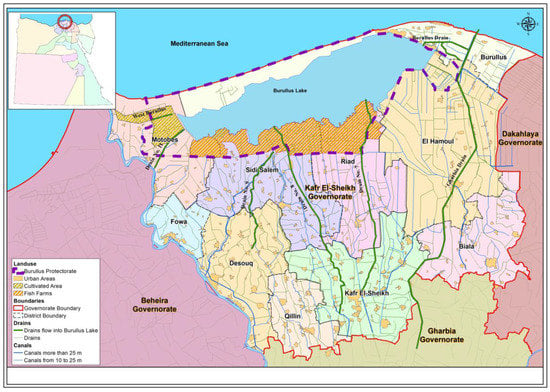 The most important human-based activities that dump into the network of drains leading to Lake Burullus are drainage wastewater, domestic wastewater, industrial wastewater, fish farm waste, and solid waste [].