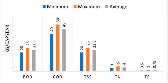 Figure 2. Generation rates for BOD, COD, TSS, TN, and TP pollutants in Egypt [].