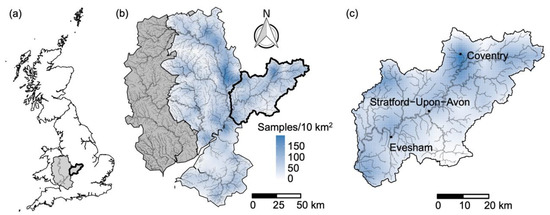 Study location and data availability. (a) Location of the study area. (b) Spatial density of invertebrate community samples used in species distribution modelling. (c) Map of case study catchment. The grey area in (b) shows the Welsh part of the Severn River Basin which was not included in our study.