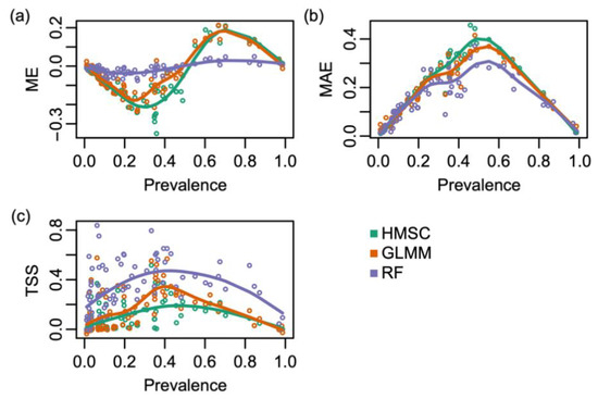 Performance of three alternative species distribution models. Mean evaluation metrics (circles) with taxon prevalence trends (lines) from generalized additive models for (a) mean error (ME), (b) mean absolute error (MAE), (c) true skill statistic (TSS). Models with ME and MAE closer to 0 and TSS values closer to 1 are considered better performing.