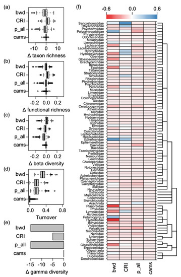 Summary of predicted responses to four high-level restoration scenarios: riparian woodland creation (“bwd”), removal of channel resectioning (“CRI”), 50% reduction in orthophosphate concentrations from all sources (“p_all”), and abstraction relicensing to bring all water resource availability classifications to “green” status (“cams”). (a–e) Predicted change in invertebrate diversity metrics following restoration. (f) Predicted change in mean taxon occurrence probabilities following restoration, with negative responses in red and positive responses in blue.