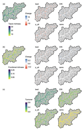 Under the four high-level restoration scenarios, only the CRI scenario was predicted to result in mean increases in taxon richness and functional richness across the case study catchment (Figure 3). The bwd (riparian woodland creation) and p_all (50% P reduction) scenarios were predicted to result in slight decreases in mean richness measures, with several river segments predicted to lose >10 taxa and >20% of their functional richness (Figure 3a,b and Figure 4). Predicted beta diversity changes were less pronounced, with slight average gains under the bwd scenario and mean decreases under p_all (Figure 3c). The bwd scenario was also associated with the highest rates of turnover (predicted change in community composition following restoration; Figure 3d), whereas the cams scenario had relatively little effect on any biodiversity indices.