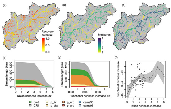 Under the eight lower-level restoration measures, all water bodies had at least one combination of measures that was predicted to increase mean taxon richness and functional richness (Figure 5a). The number of restoration measures required to maximise increases in taxon richness (Figure 5b) and functional richness (Figure 5c) ranged from a single measure to a combination of four measures. The CRI measure was most commonly involved in the set of measures predicted to maximise increases in taxon richness (Figure 5d) and functional richness (Figure 5e). Taxon richness along 100% of the total 1380 km stream length was predicted to benefit to some degree from the removal of channel resectioning, whereas for functional richness 1352 km (98%) of stream length was predicted to respond positively to this measure. The bwd and p_urb (50% P reductions from urban sources) measures were also involved in predicted increases in taxon richness across 29% of the total stream length, and increases in functional richness across >50% of the total stream length. By contrast, the cams95 measure was predicted to benefit biodiversity along <5% of the stream length, whereas the cams30 measure was not predicted to benefit biodiversity anywhere within the case study catchment. Figure 6 shows where each lower-level restoration measure contributed to recovery potential throughout the catchment. In general, increases in taxon richness and functional richness were predicted to occur in unison, albeit with considerable variation and a levelling-off of functional richness increases at higher taxon richness increases (Figure 5f).