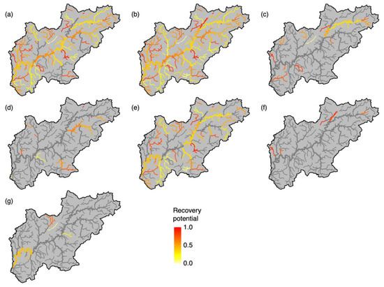 Lower-level restoration measures contributing to recovery potential across the Warwickshire Avon case study catchment: riparian woodland creation (a); removal of channel resectioning (b); 50% reduction in P concentrations from livestock (c), wastewater treatment (d), urban (e) and arable (f) sources; and abstraction relicensing to bring water resource availability classifications to “green” status at low flows (g). All panels show the recovery potential where the corresponding measure contributed to the combination of measures predicted to maximise biodiversity. River segments where the measure did not contribute are plotted in grey.