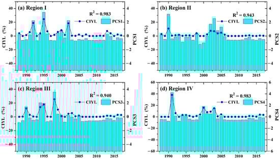 | Region IV | CIYL = 3.74 + 2.36 × PNA_Aug_cu − 2.21 × SOI_May_co (R2 = 0.213) | |||||||||