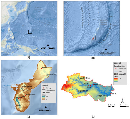 Geographical information on the study area (Pago Watershed) in Guam. (A) location of the island of Guam in the Pacific Ocean, (B) location of the island in the Mariana region, (C) location of the Pago Watershed in Guam, and (D) the study area which encompasses the Pago Watershed, including the Lonfit, Sigua, and Pago rivers. Red points denote the rain gages in (C) and sampling sites in (D) for water quality tests. Sources for World Ocean Reference and Bases in (A–C) are Esri, GEBCO, NOAA, National Geographic, Garmin, HERE, Geonames.org, and other contributors.