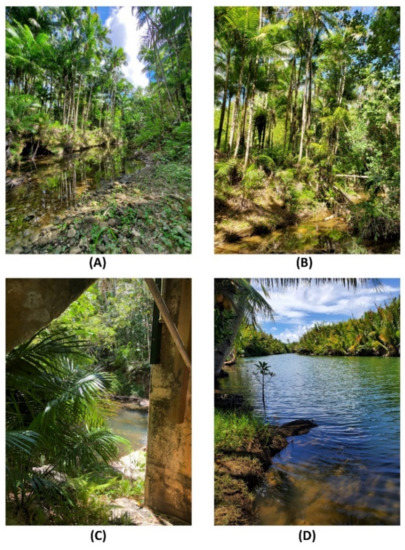 Photos for each sampling site. (A) upstream from Ordot Landfill, (B) downstream from Ordot Landfill, (C) USGS Pago River streamflow gauge, and (D) near Pago River mouth.