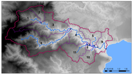 Figure 11 shows how each sub-basin contributes to sediment loads, with respect to various time scales. The Pago River section (sub-basin 4, 7, 8, and 9) produces more sediments compared to other sub-basins, based on the annual total sediment loading map (Figure 11A), while sub-basins 2, 5, and 8 are most vulnerable to heavy rainfalls, based on the seasonal variation results which show these sub-basins to have the highest values (Figure 11B). Figure 11C,D illustrate time variation ratios comparing the sediments values of validation period to those of calibration period for dry and wet periods, respectively. Overall, the sediment loads show a reduced rate, with the exception of sub-basin 11 for the dry season.