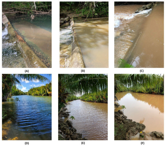Site photos with respect to different sampling times. The top three photos were taken from Site 3, and the bottom three from Site 4. (A,D) were taken during a dry monsoon condition, (B,E) on 23 June 2021 (the day after Tropical Depression 06W), and (C,F) on 2 August 2021.