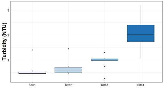 Statistical analyses were carried out for identifying the location of most concern in relation to water quality aggravation. Since heavy rainfall disrupts the hydrological system within the watershed, an Analysis of Variance (ANOVA) test was implemented only on the data collected under dry-day conditions. From the one-way ANOVA test conducted, it was found that there were statistically significant differences in group means of turbidity (F value = 20.4 and p-value 3.29 × 10−7). Tukey’s honestly significant difference test (HSD), which was implemented for the multiple comparison procedure, identified that turbidity at Site 4 was statistically different from the other sites (see Figure 6). In addition to the turbidity tests, IDN concentrations at the first three sites were under detection limit. It has, therefore, been concluded that the target stressors are highly likely to be released significantly from Pago River.