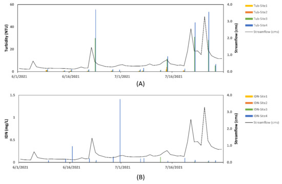 Observed streamflow at Site 3, and turbidity and IDN data at four sites for the project period (1 June–4 August). (A) turbidity values at four sites, (B) IDN values at four sites.