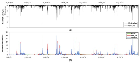 (A) Daily measured rainfall data sets from Mt. Chachao and Fena Lake rain gauge stations, and (B) observed, simulated daily streamflows, and the estimated 95% model uncertainty at USGS Pago River station (16,865,000) for the calibration period (2012–2018).