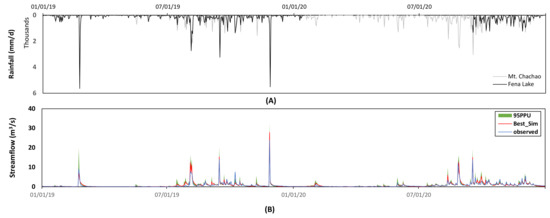 (A) Daily measured rainfall data sets from Mt. Chachao and Fena Lake rain gauge stations, and (B) observed, simulated daily streamflows, and the estimated 95% model uncertainty at USGS Pago River station (16,865,000) for the validation period (2019–2020).