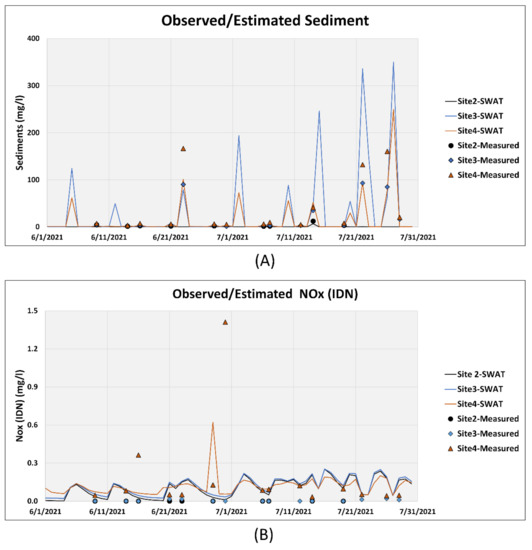 Comparison of the sediments (A) and IDN (B) estimated by the calibrated SWAT model with the measured values for the period of 1 June to 31 July 2021.
