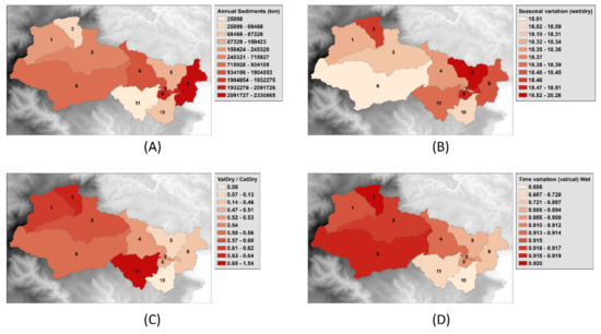 Sediment contribution maps. (A) Average annual total sediments, (B) seasonal variation (ratio of wet to dry), (C) time variation (ratio of validation to calibration periods) for the dry season, and (D) time variation (ratio of validation to calibration.
