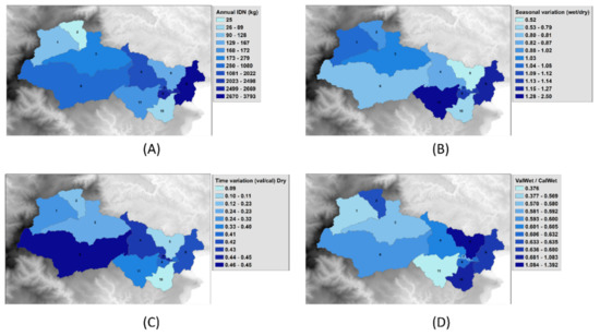 IDN contribution maps. (A) Average annual total sediments, (B) seasonal variation (ratio of wet to dry), (C) time variation (ratio of validation to calibration periods) for the dry season, and (D) time variation (ratio of validation to calibration periods) for the wet season.