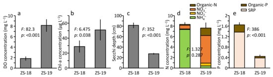 Comparisons of DO (a), Chl-a (b), transparency (c), and N (d) and P (e) concentrations between ZS-18 (before installation) and ZS-19 (after installation). Error bars are standard deviation (n: 4–6). Organic portion of nutrients were calculated from the difference between total and other forms. Results of ANOVA are also shown.