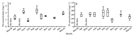 Nutrient concentrations varied among months, but no clear seasonal trend was observed (Figure 4 and Figure S2). For example, TN varied from 0.80 to 2.33 mg L−1 and was higher in June and September than in the other months (Figure 4a). NH4+-N was higher in April, September, and October (0.21–0.26 mg L−1) compared to the other months (0.10–0.16 mg L−1), whereas NO3−-N was higher in April, November, and March 2019 (0.64–1.01 mg L−1) than the other months (0.34–0.48 mg L−1). TP varied from 0.035 mg L−1 in November to 0.070 mg L−1 in September and October (Figure 4b). SRP was higher in July, September, October, and January (0.045–0.060 mg L−1) than in the other months (0.025–0.040 mg L−1).