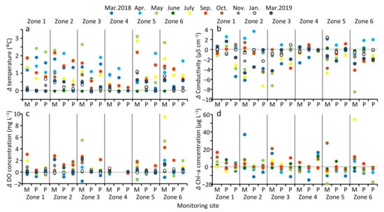 Surface-to-bottom vertical difference (Δlayer) of temperature (a), EC (b), DO concentration (c), and Chl-a concentration (d) at 18 sites in MA. M: middle, P: periphery. Color shows month corresponding to that in other figures.