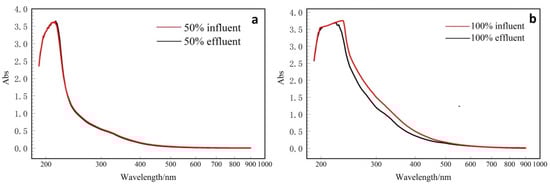 Results of the UV-Vis analysis for the influent and effluent in the acclimation system. (The proportion of SBECW in the influent and effluent was 50% (a); The proportion of SBECW in the influent and effluent was 100% (b)).