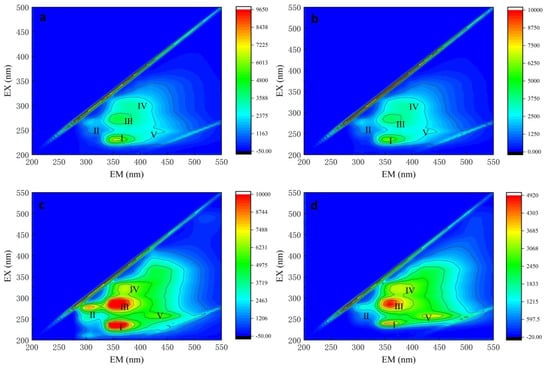 The fluorescence images of wastewater were divided into five regions [29] (Table 2). In general, the peaks of shorter excitation wavelengths (<250 nm) and shorter emission wavelengths (<350 nm) are related to simple aromatic proteins such as tyrosine (Regions I and II). The peaks of shorter excitation wavelengths (<250 nm) and longer emission wavelengths (>350 nm) are related to fulvic-acid-like materials (Region III). The peaks of intermediate excitation wavelengths (250–280 nm) and shorter emission wavelengths (<380 nm) are related to soluble-microbial-byproduct-like material (Region IV). The peaks of longer excitation wavelengths (>280 nm) and longer emission wavelengths (>380 nm) are related to humic-acid-like organics (Region V) [30].