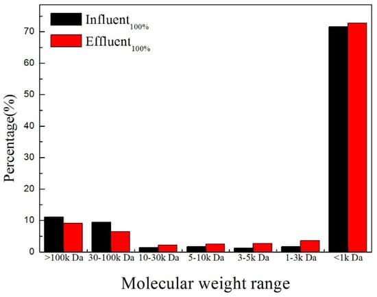 The molecular weight distributions of organic matter in the wastewater were analyzed by using the continuous filtration method. As shown in Figure 3, the molecular weight distribution of influent and effluent organic matter in the acclimation system exhibits a U-shape. Jin and colleagues also showed that the molecular weight distribution of influent and effluent organic matter in various biological reaction pools exhibits a U-shape [38]. Most organics in the influent and effluent showed molecular weights above 30 k Da or below 1 k Da (Figure 3). The proportions of organic matter with molecular weights over 30 k Da in the influent and effluent were 20.58% and 15.54%, respectively. The organic matter with molecular weights below 1 k Da in the influent and effluent accounted for 71.59% and 72.78%, respectively. Compared to the influent, the proportions of soluble, macromolecular organic matter decreased and the proportions of micromolecular organics increased in the effluent. The organic matter of the influent in the molecular weight distribution ranges of 10–30 k Da, 5–10 k Da, 3–5 k Da and 1–3 k Da were lower than 5%, respectively. This reflects that these ranges of organic matter are difficult to degrade using a biological process [39]. However, the proportions of the organics matter in these weight distribution ranges in the effluent were all higher than those of in the influent (Figure 3). Therefore, it can be deduced that some macromolecular organic matter of a molecular weight above 30 k Da were converted or decomposed by microorganisms into substances of smaller molecular weights. Together, these results indicate that some soluble, macromolecular organic matter in the influent were converted to micromolecular organics during the acclimation process.