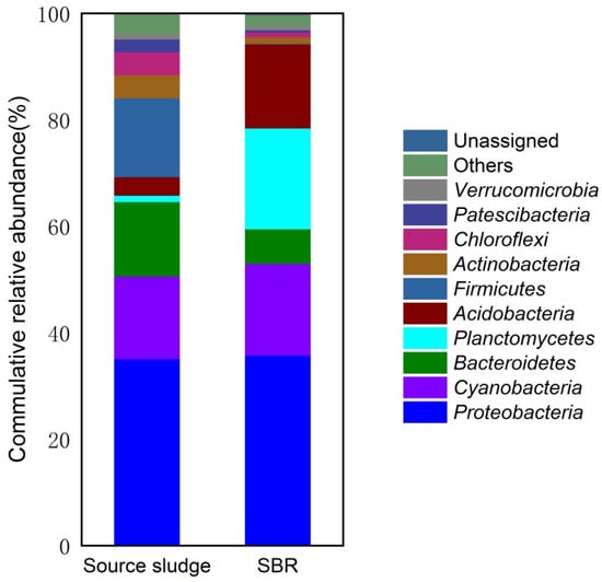 Phylum distribution of the microbial communities in source sludge and SBR are displayed in Figure 4. At the phylum level, Proteobacteria (35.03%), Cyanobacteria (15.52%), Firmicutes (14.79%), Bacteroidetes (14.02%), and Actinobacteria (4.36%) were dominant in the source sludge. On the other hand, Proteobacteria (35.72%), Planctomycetes (18.94%), Cyanobacteria (17.19%), Acidobacteria (15.78%), and Bacteroidetes (6.53%) were dominant in the domesticated sludge. The relative abundance of Planctomycetes increased from 1.18% to 18.94% after domestication. A previous study reported that Planctomycetes participated in the degradation of polymeric organic compounds [41]. In addition, Proteobacteria were slightly more abundant in the domesticated sludge. This phylum was reported to be the most abundant phylum in several CWW treatment plants [42]. In addition, a previous study reported that Proteobacteria can participate in the degradation of phenol, polycyclic aromatic hydrocarbons, nitrogen-containing heterocyclics, and other recalcitrant organic compounds in CWW [43,44]. Together, these results indicate that the bacteria showing a capacity for the degradation of some toxic and refractory compounds were enriched after domestication.