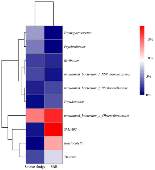 The relative abundance of the dominant genera (with relative abundances over 1%) in the source sludge and in the SBR are displayed in Figure 5. Among them, the relative abundance of Thauera was 8.91% in the SBR, which was much higher than that of the source sludge (1.25%). Thauera plays an important role in the removal of pollutants including ammonium-nitrogen, organic matter, and aromatic compounds [45]. This genus was also shown to be a quinoline-degrading taxon in CWW [46]. Consistent with our study, a previous investigation found that Thauera was enriched (with a relative abundance of 6.26%) in the acclimated activated sludge in an SBR [47]. Moreover, the relative abundances of Pesudomonas and Blastocatella were 3.35% and 10.76%, respectively, in the SBR, which was higher than those found in the source sludge (0.06% and 0.02%, respectively). Blastocatella is considered to be a subfamily of Acidobacteria and is an aerobic heterotrophic bacterium, which can use oxygen as a receptor to transform the complex organic hydrocarbons and nitrogen-containing substances into small molecules [48]. Pesudomonas has the potential to degrade phenol and chlorophenol [49,50,51]. Overall, we found that the genera that possessed a high tolerance and strong metabolism for recalcitrant compounds were enriched after acclimation.