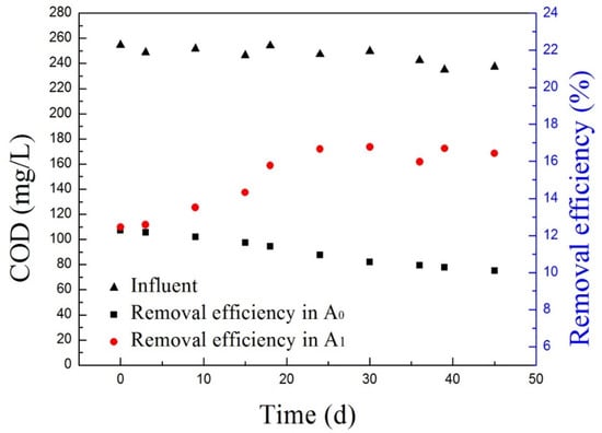 To decipher the effect of glucose addition on SBECW treatment by the acclimated activated sludge, the COD removal performance of two parallel SBRs (A0 (glucose-free) and A1 (glucose added)) were analyzed. The influent COD values and the removal efficiencies of the two bioreactors are shown in Figure 6. After 18 days in operation, the treatment efficiencies of COD in A1 became stable and were between 15.78% and 16.78%, which was higher than those of the A0 system (11.41–10.11%) (p < 0.05). A previous study also reported that without the assistance of co-metabolic substrates, the refractory and toxic organics presented in wastewater might inhibit microorganisms from degrading organic matter for a long time [14]. Therefore, it can be deduced that glucose functioned as a co-metabolic substrate and the degradation of some organic pollutants in the A1 system was enhanced through microbial co-metabolism as compared to that in the A0 system.