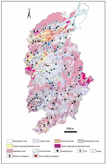 The landforms of the Ganjiang River Basin are mainly mountainous and hilly and are distributed in a ladder shape along the flow direction of the Ganjiang River from south to north. The mountainous and hilly areas in the upper reaches of the Ganjiang River Basin account for 83% of the total area, low hilly land accounts for 15.6%, and plains account for only 1.5%. The area of mountainous hills in the middle reaches accounts for 56.7%, low hills and mounds account for 38.1%, and plains account for 5.2%. In the lower reaches, the area of mountainous hills accounts for 37%, the area of low hills and mounds accounts for 55.9%, and the plains account for 7%. The upper reaches of the basin are mainly composed of clastic and magmatic rocks. The middle reaches mainly consist of clastic rocks, and the lower reaches mainly consist of metamorphic and clastic rocks. Forestry and agriculture are the main activities in the basin. However, with the rapid development of railways and highways, the communications between the middle and upper reaches of the basin have improved, which has greatly promoted the economic development of the Ganjiang Basin. In particular, the mineral resources in the Ganjiang River Basin are extremely characteristic. Large quantities of rare earth and tungsten ores are distributed in the upper reaches of the southern region, while the minerals in the middle reaches are less distributed. In the lower reaches of the north, there are concentrations of coal and rare metals (Figure 1).