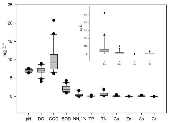 Box diagram of measured values of Ganjiang River System. (the pH is dimensionless, and the unit of Cu, Zn, As, and Cr in the large box diagram is μg L−1, and other elements are mg L−1).