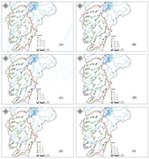 The DO, COD, and BOD values reflect the degree of pollution of water bodies and are a comprehensive indicator of the relative organic matter content and are an important indicator for complete pollution control and water environmental management []. The dissolved oxygen (DO) concentrations in the upper reaches of the Ganjiang River ranged between 4.10–9.06 mg L−1, with an average value of 7.03 mg L−1. The DO concentrations in the middle and downstream reaches were between 6.52 and 8.13 mg L−1 and 6.25–7.48 mg L−1, with average values of 7.07 mg L−1 and 6.95 mg L−1, respectively (Table 1). The average DO level of the Ganjiang tributaries was 6.60 mg L−1 (Table A2). The COD concentrations in the Ganjiang River Basin ranged from 6.19 mg L−1 to 20.79 mg L−1, with an average of 10.34 mg L−1. The average COD concentration in the tributaries was 9.32 mg L−1 (Table 1 and Table A2). The BOD5 concentrations in the main stream and tributaries of the Ganjiang River were 0.93–4.33 mg L−1 and 0–3.63 mg L−1, respectively, with averages of 2.31 mg L−1 and 1.63 mg L−1, respectively. The COD and BOD5 concentrations in the main stream basin of the Ganjiang River were higher in the upper and lower reaches, while the areas with higher COD and BOD5 concentrations in the tributary basins were located in Taojiang, Shangyoujiang, Jinjiang, and Gujiang (Figure 3 and Table A2).