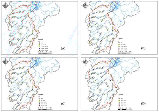 The variation trend of concentration of Cu, Zn, Cr6+ and As in the Ganjiang river basin. ((A), Cu; (B), Zn; (C), Cr6+; (D), As) (μg·L−1).