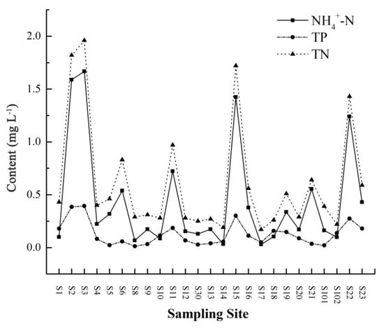 As shown in Figure 5, the NH4+-N, TP, and TN concentrations in the main stream of the Ganjiang River vary from 0.03–1.67 mg L−1, 0.06–0.39 mg L−1, and 0.19–1.96 mg L−1, respectively. The average NH4+-N, TP, and TN values in the main stream of the Ganjiang River (Table 1) were 0.44 mg L−1, 0.13 mg L−1, and 0.62 mg L−1, respectively. The average NH4+-N, TP, and TN values in the tributaries of the Ganjiang River were 0.42 mg L−1, 0.09 mg L−1 and 0.63 mg L−1, respectively. The nitrogen and phosphorus that is present in the water bodies comes mainly from farmland water, urban wastewater, and groundwater []. The chemical forms and migration abilities of heavy metals are closely related to the activity of NH4+ in the water environment []. The greater the NH4+ content in water is, the easier it is to cause pollution by heavy metal regeneration.