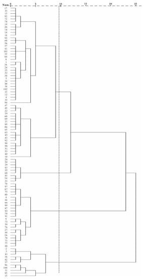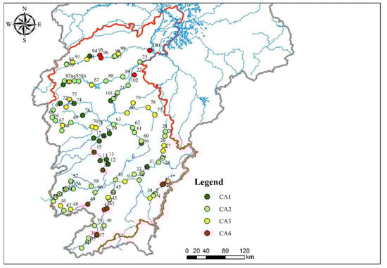 Cluster analysis (CA) is an evaluation technique that can classify groups with similarities based on variable homogeneity and can identify the similarities among individuals contained in the same cluster and the differences among individuals in different clusters []. To classify the homogeneous clusters, hierarchical analysis was carried out sequentially. Then, the Euclidean distance method was used to calculate the distances between clusters, and Ward’s method was used to analyze the clusters []. By using cluster analysis (CA) to generate a dendrogram (Figure 6), the Ganjiang River Basin was divided into four statistically significant clusters (Figure 7). Among them, 15% of the sampling points of CA1 (12, 13, 14, 16, 17, 18, 19, 20, 31, 59, 72, 74, 76, 82, 94) were in the area and were mainly located in Lushui and the middle reaches of the main stream of the Ganjiang River (Figure 1). In CA2 (1, 4, 5, 8, 10, 21, 23, 24, 25, 28, 29, 30, 32, 33, 34, 35, 36, 39, 40, 43, 45, 47, 50, 51, 52, 53, 54, 55, 56, 57, 58, 60, 61, 62, 63, 64, 65, 66, 68, 69, 83, 85, 86, 88, 89, 90, 92, 98, 101, and 102), 50% of the sampling points were in same the region and were mainly located in the upper and lower reaches of the Ganjiang River and tributaries of the Ganjiang River (e.g., Taojiang, Yuanshui, Meijiang, Heshui, Shangyoujiang, Gujiang, Zhangshui) (Figure 1). In CA3 (6, 9, 26, 27, 44, 46, 48, 67, 70, 71, 73, 75, 77, 78, 79, 80, 84, 87, 91, 93, 97, and 99), 22% of the sampling points were located in the same area and were located mainly in Jinjiang, Zhangshui, and Enjiang (Figure 1). CA4 (2, 3, 11, 15, 22, 37, 38, 41, 42, 49, 95, 96, and 100) had 13% sampling points in the same area, which were mainly distributed in Taojiang, Jinjiang, and Ganjiang upstream of the main stream (Figure 1 and Figure 6). These results were very similar to the clustering results of the PCA. This result proves the validity of the principal component analysis results.